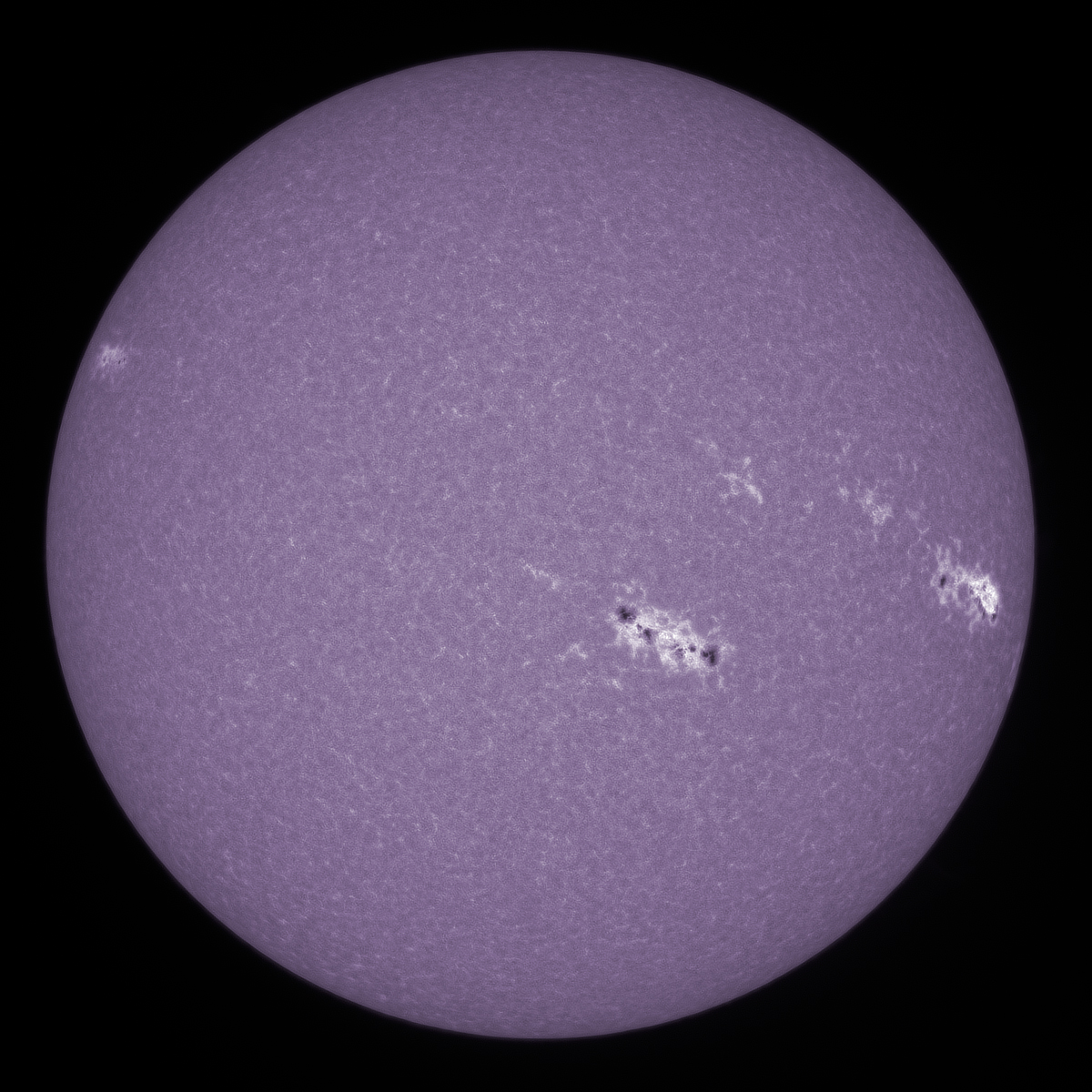 The sun looked great in CaK light today, lots of activity, including a pair of small spots that have come around the eastern limb. Taken with the 40mm scope at 400mm focal length, home made CaK filter and the PGR Chameleon 3 camera.