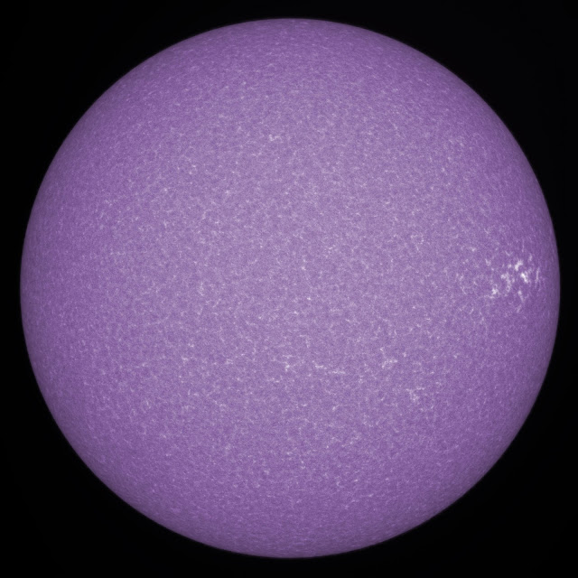 A far from ideal CaK full disk, but the first one i've been able to take in a while. The sun was heading into the trees (see the shadow bottom right) and the seeing was less than ideal for the 80mm aperture used, but it does show that the 1000mm focal length used fits easily on the chip of the PGR ICX814 sensor. Next time i'll try backing off the aperture to 60mm and see how I get on.